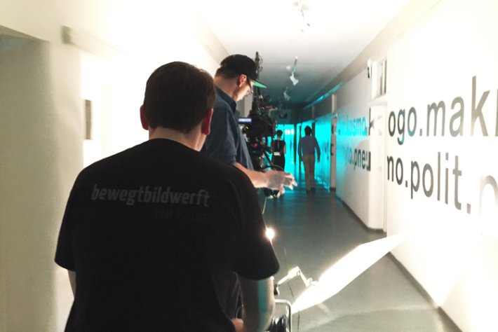 Meine Aufgabe in dieser Nacht: Ich bin für den Dolly zuständig, den Kamerawagen. Für den Kurzfilm wird eine lange Fahrt durch einen Gang gedreht, bei der die Kamera immer wieder stehen bleibt. Alles muss genau abgestimmt und geprobt werden, um zur richtigen Zeit am richtigen Ort zu sein. Nach den ersten drei Versuchen blickt unser Kameramann noch skeptisch. „Wir haben ein paar Wackler drin!“ Also alles zurück auf Ausgangsposition. Und schnell wird klar, dass nicht nur die unterschiedlichen Geschwindigkeiten eine Herausforderung sind, sondern auch diverse Bodenwellen im Gang.